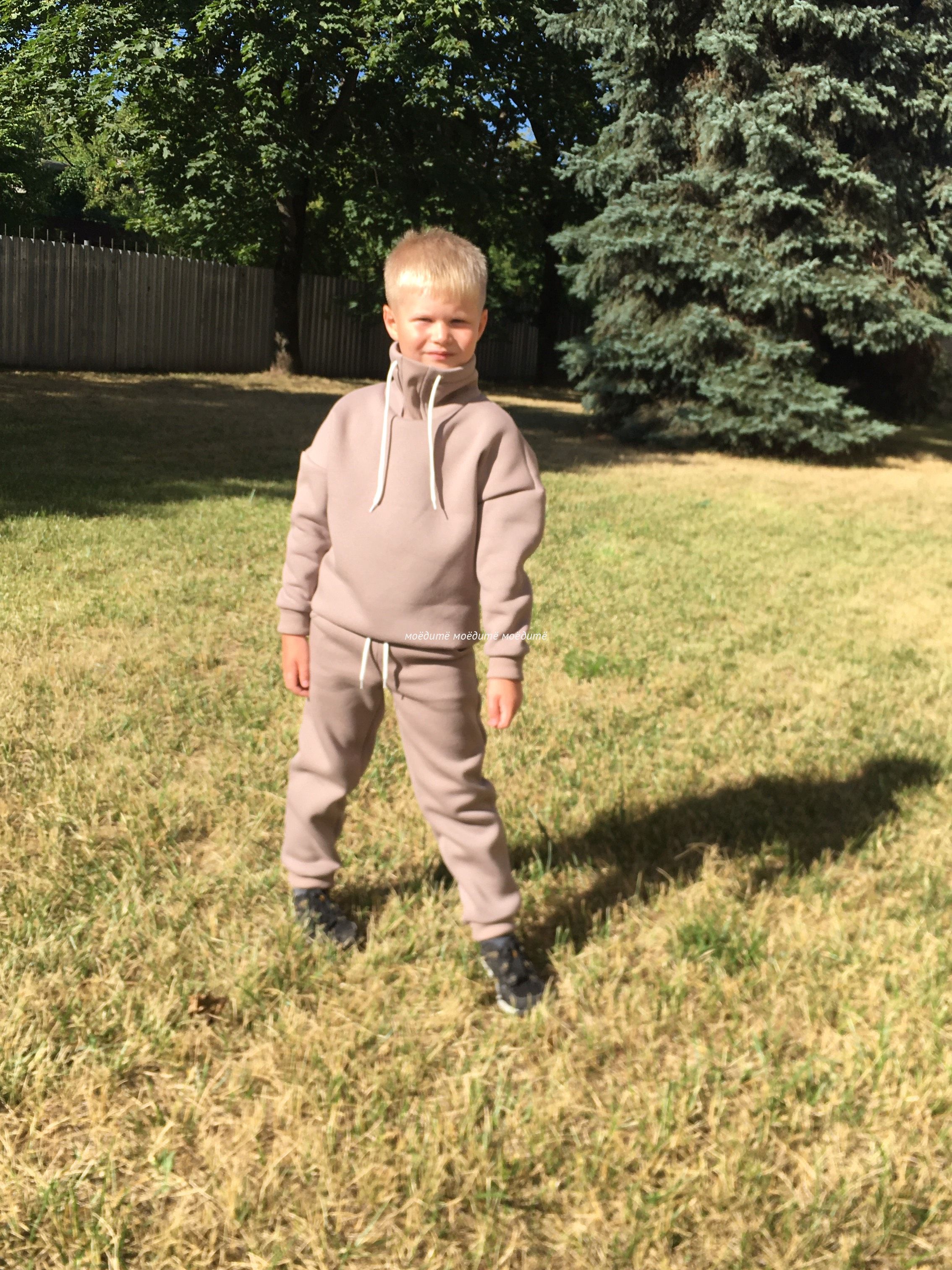 Костюм выполнен из футера 3-хнитки с начёсом. Состоит из свитшота и брюк. Брюки сверху на широкой резинке и со шнурком, снизу на манжете с отворотом. Свитшот с воротником-стойкой, украшен шнурком, снизу вставлена резинка, рукава на манжетах с отворотом.