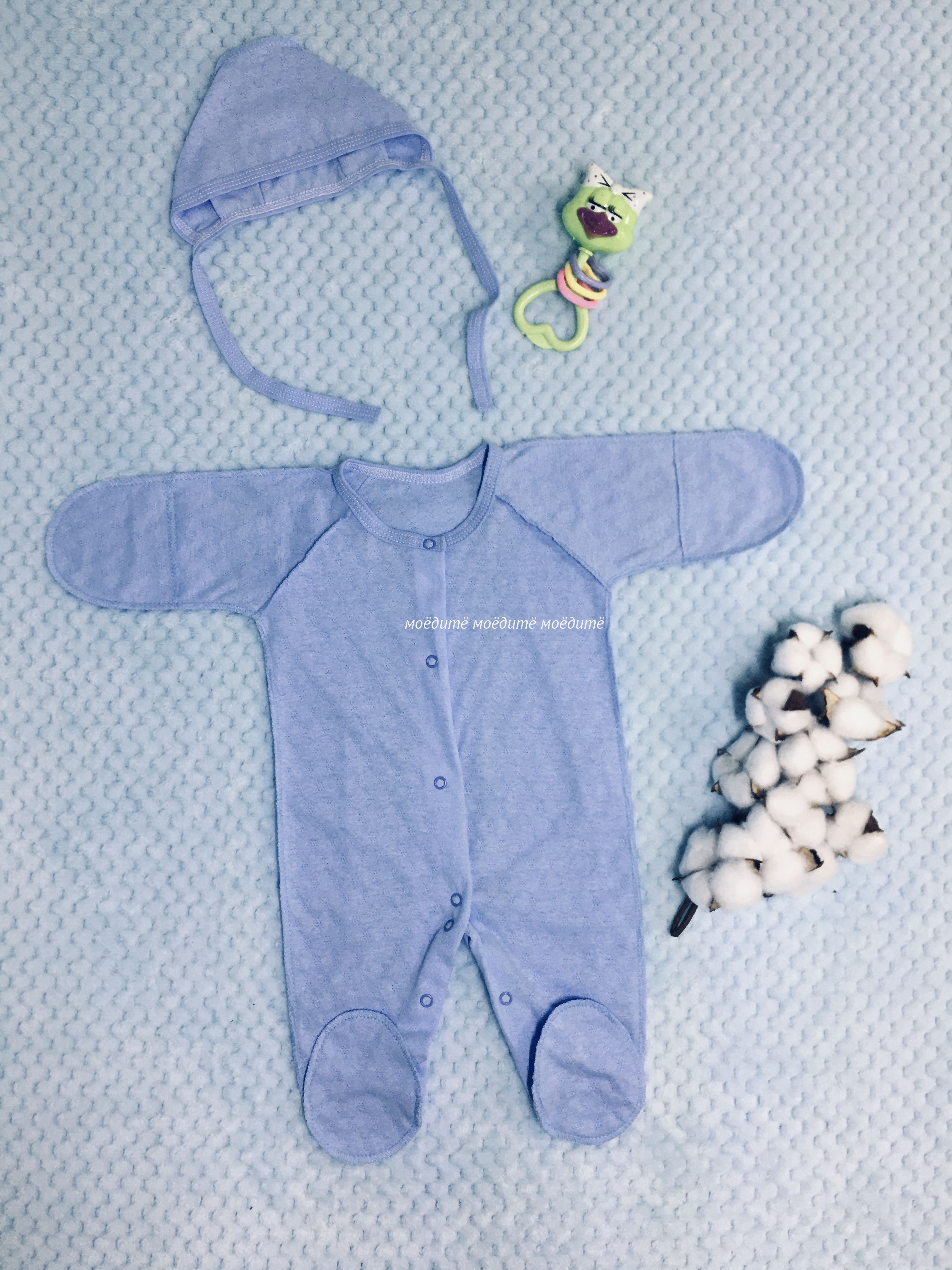 Комплект состоит из комбинезона без воротничка, с закрытыми ножками, рукавчики с царапками, спереди и между ножек на кнопочках и чепчика на завязках. Все швы у комплекта выполнены наружу.